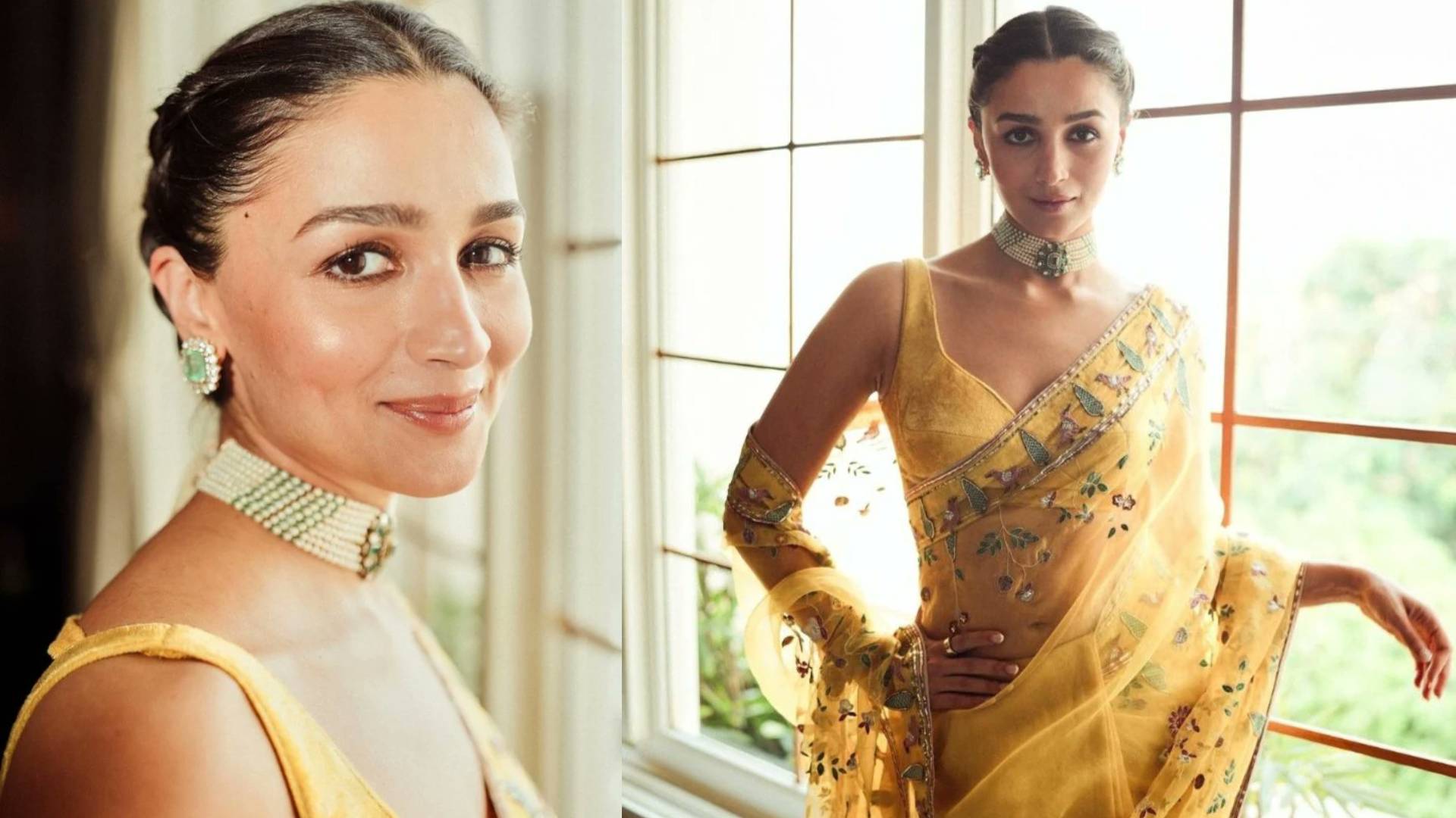 She wore a stunning yellow-coloured net saree adorned with intricate embroidery and paired it with a chic sleeveless blouse. Alia's choice of jewellery was nothing short of exquisite, featuring an emerald choker necklace, matching studs and a ring.