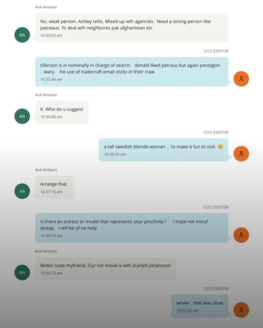In subsequent messages, the two discussed preferences in women. Epstein wrote, “is there an actress or model that represents your proclivity.? i hope not meryl streep. I will be of no help.” Ambani replied, “Better taste myfriend. Our nxt movie is wth scarlett johansson.”