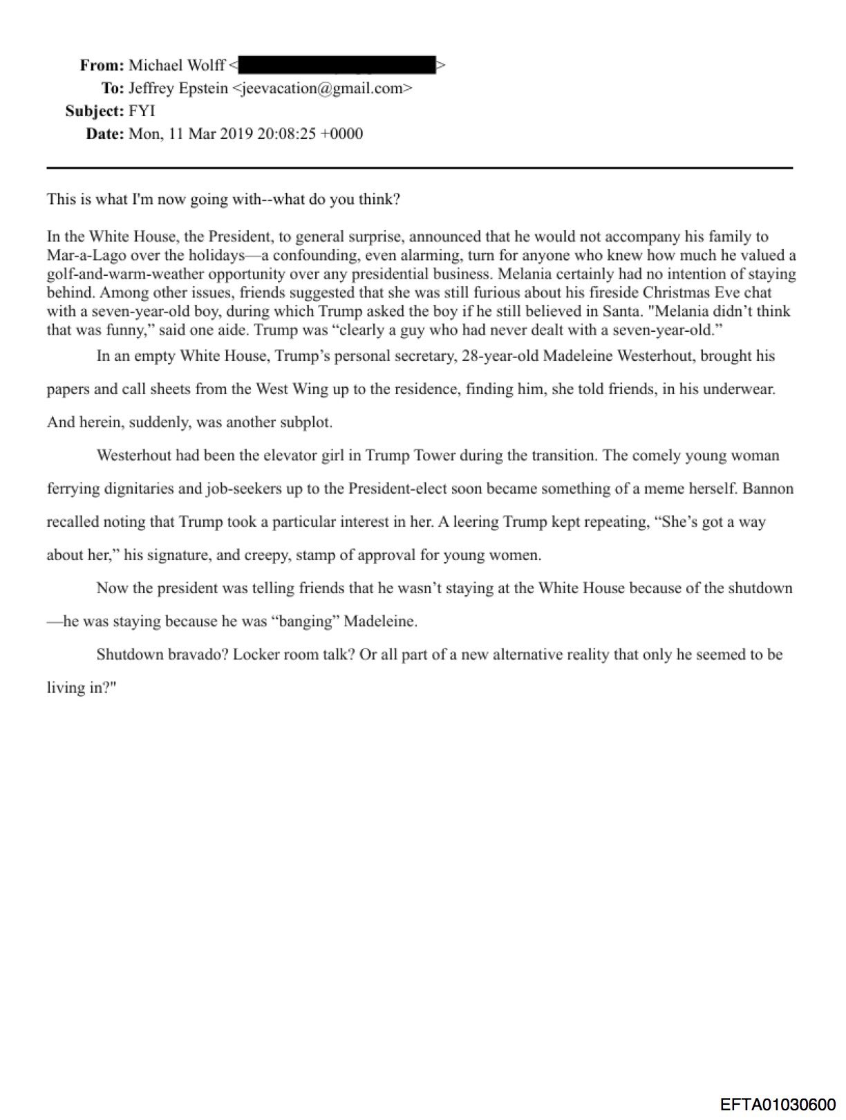 The scandal theory originates from Wolff's draft email to Epstein, part of material for an unpublished book.