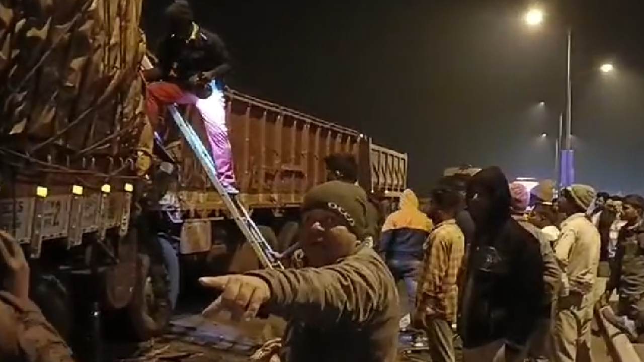 A truck from Andhra Pradesh, carrying iron rods, was stationary on the overbridge due to the breakdown of its engine. Another truck, also loaded with iron rods, came at a very high speed and hit it (the standing truck) on the backside.