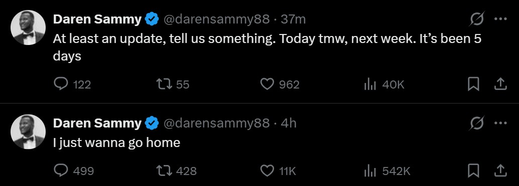 just wanna go home,” said Sammy on his ‘X’ account on Thursday.
